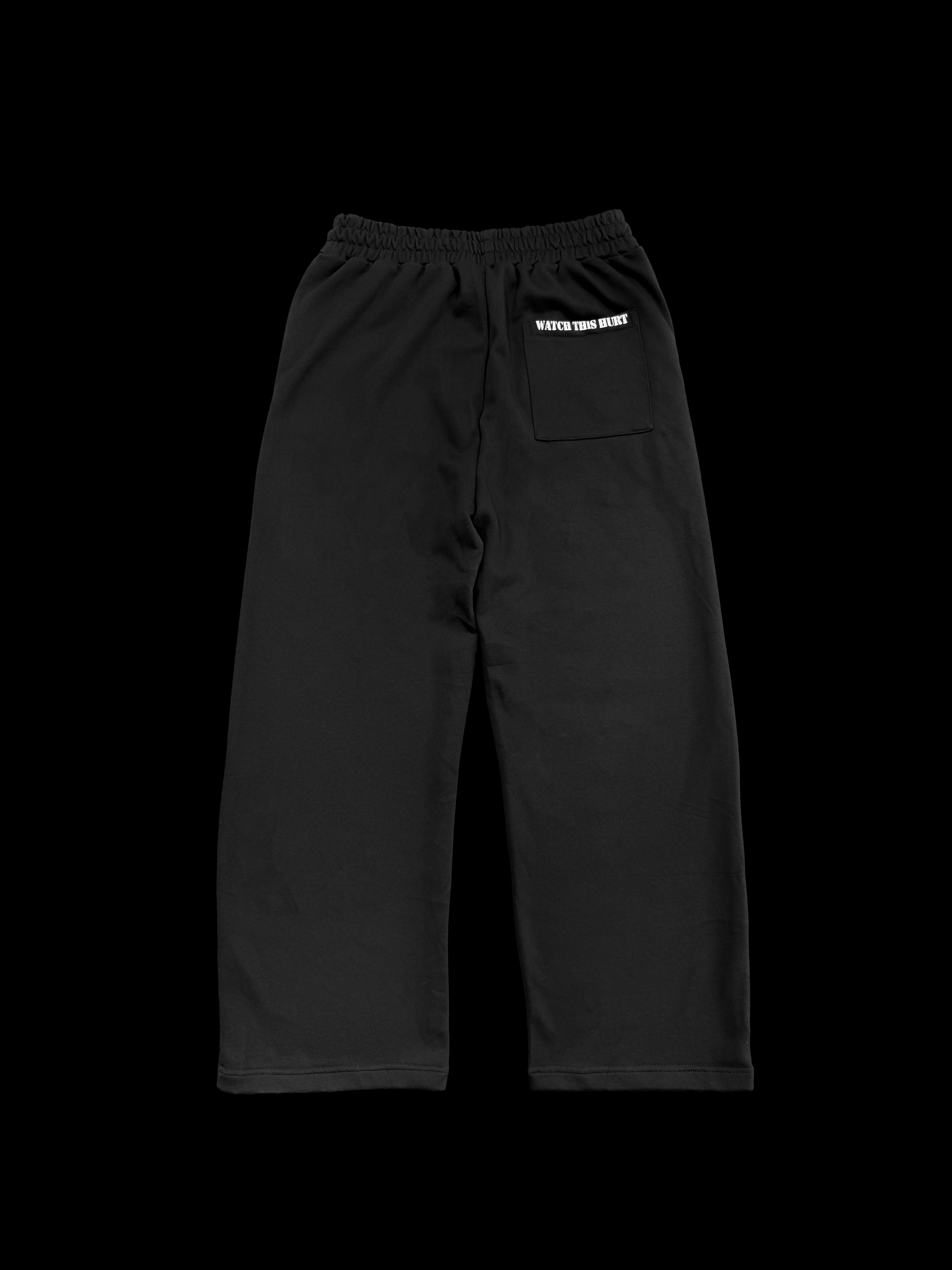 Essentials Sweatpants - In and out of the gym you're fly. Featuring a front cross print and a back print "watch this hurt" - back pocket, side pockets, internal drawstrings and is a relaxed straight leg / slightly baggy fit.